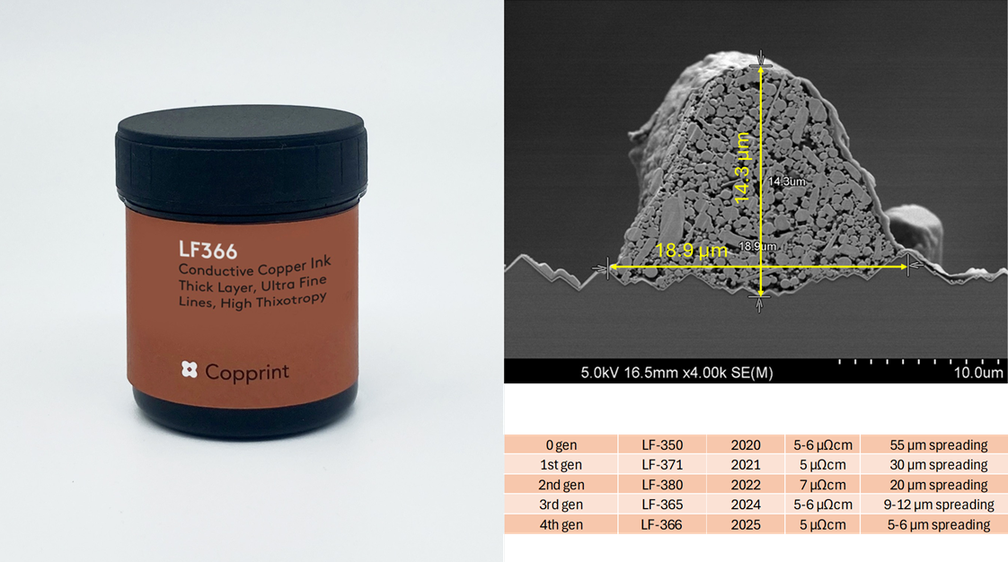 This 4th-generation copper ink allows high thixotropy, low spreading, and top conductivity of 5 μΩcm. See https://lnkd.in/dXUXvzM3.